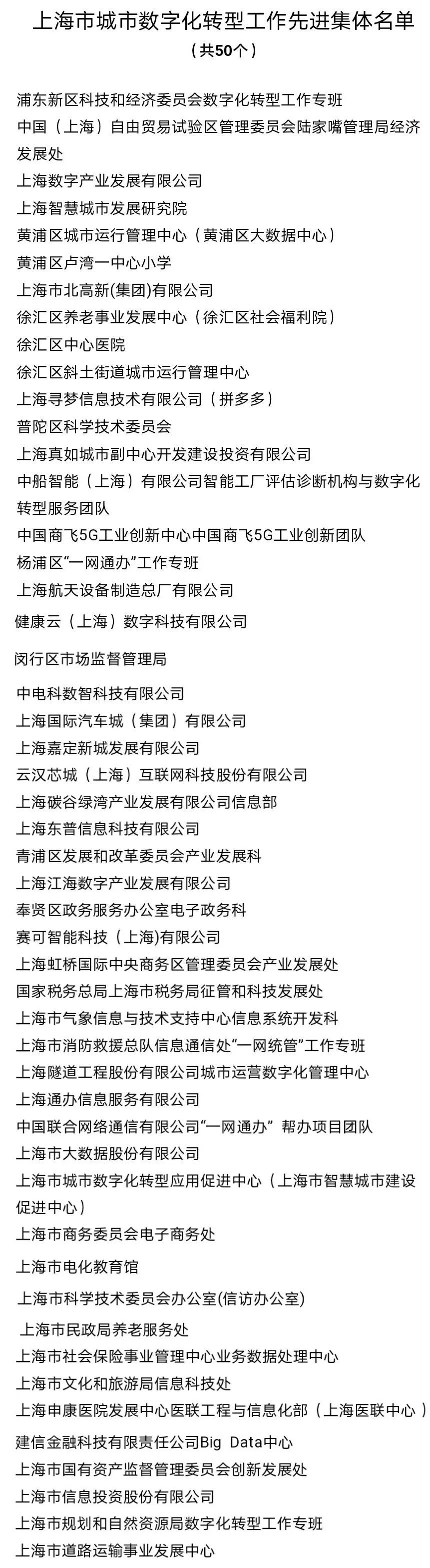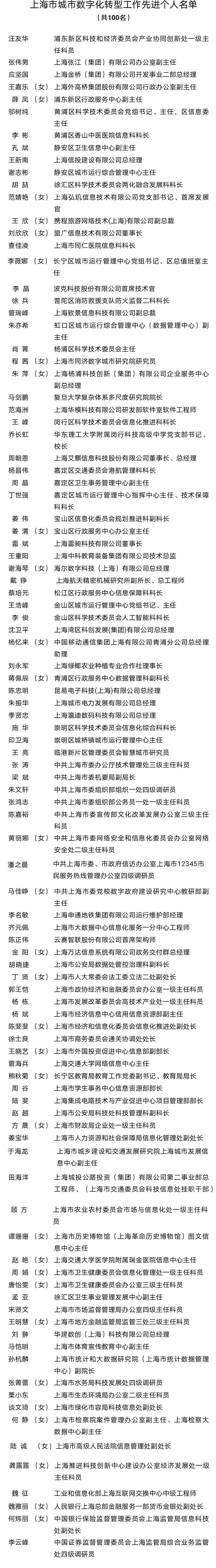 为表彰先进、树立典型,充分激发广大企事业单位、干部群众顺应科技和产业变革、投身数字化转型工作,上海市城市数字化转型工作领导小组办公室、上海市经济和信息化委员会、上海市人力资源和社会保障局决定,授予浦东新区科技和经济委员会数字化转型工作专班等50家单位“上海市城市数字化转型工作先进集体“称号;授予汪友华等100名同志”上海市城市数字化转型工作先进个人“称号。