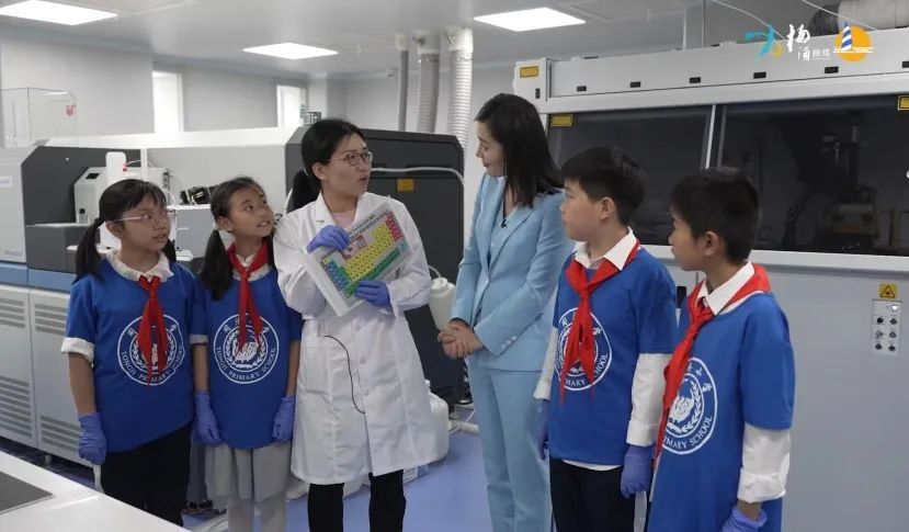 在同位素地球化学分析室,向观众展示通过移液器移取液体的实验,来精准配置一定浓度的液体。
