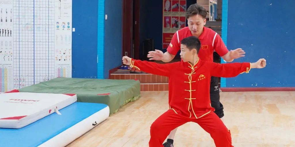 “正好放暑假了,就想带孩子来练武术,培养孩子的精气神,修正平时一些不良习惯。”跆拳道训练的另一边,正在进行的是散打和武术训练,热身运动结束后,小朋友们便站成两排,和老师们一起蹲马步、左右出拳。