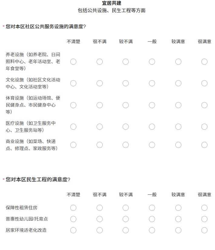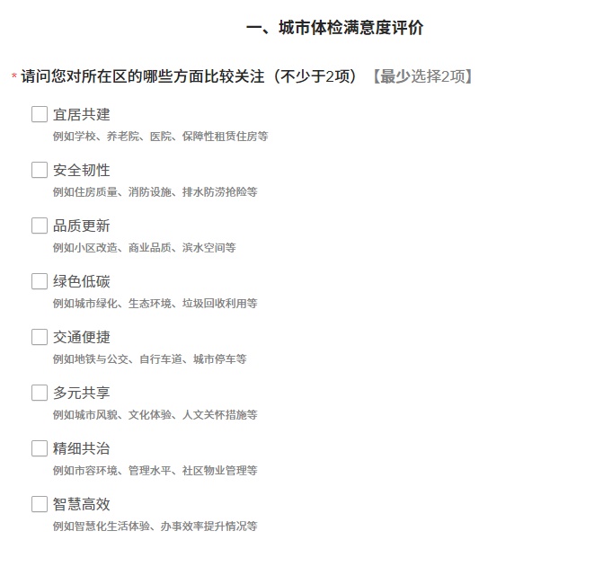 现围绕宜居共建、安全韧性、品质更新、绿色低碳、交通便捷、多元共享、精细共治、智慧高效八大维度开展满意度调查,诚邀您一起为城市健康发展把脉问诊、建言献策。大家可以点击“阅读原文”进入问卷并填写,问卷填写截止时间:2023年8月30日。详见↓