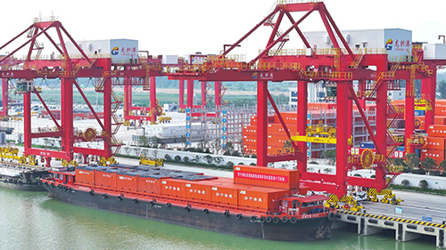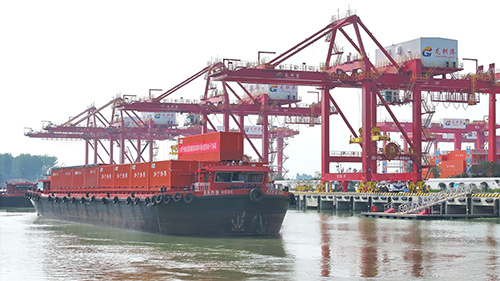 “润杨集6006”号船舶装着面粉、焦炭、煤炭、成品纸、石材等货物,从龙拱港满载下行,8月22日左右抵达江苏如皋港换乘海船。4天后,这些集装箱即到达广州黄埔港,再经汽车被运往各地卸货完毕。随后,船舶又会载着广西的石粉、佛山的瓷砖等回程至济宁,这种“公河海多式联运”和“钟摆式”运输,在济宁港已成现实。