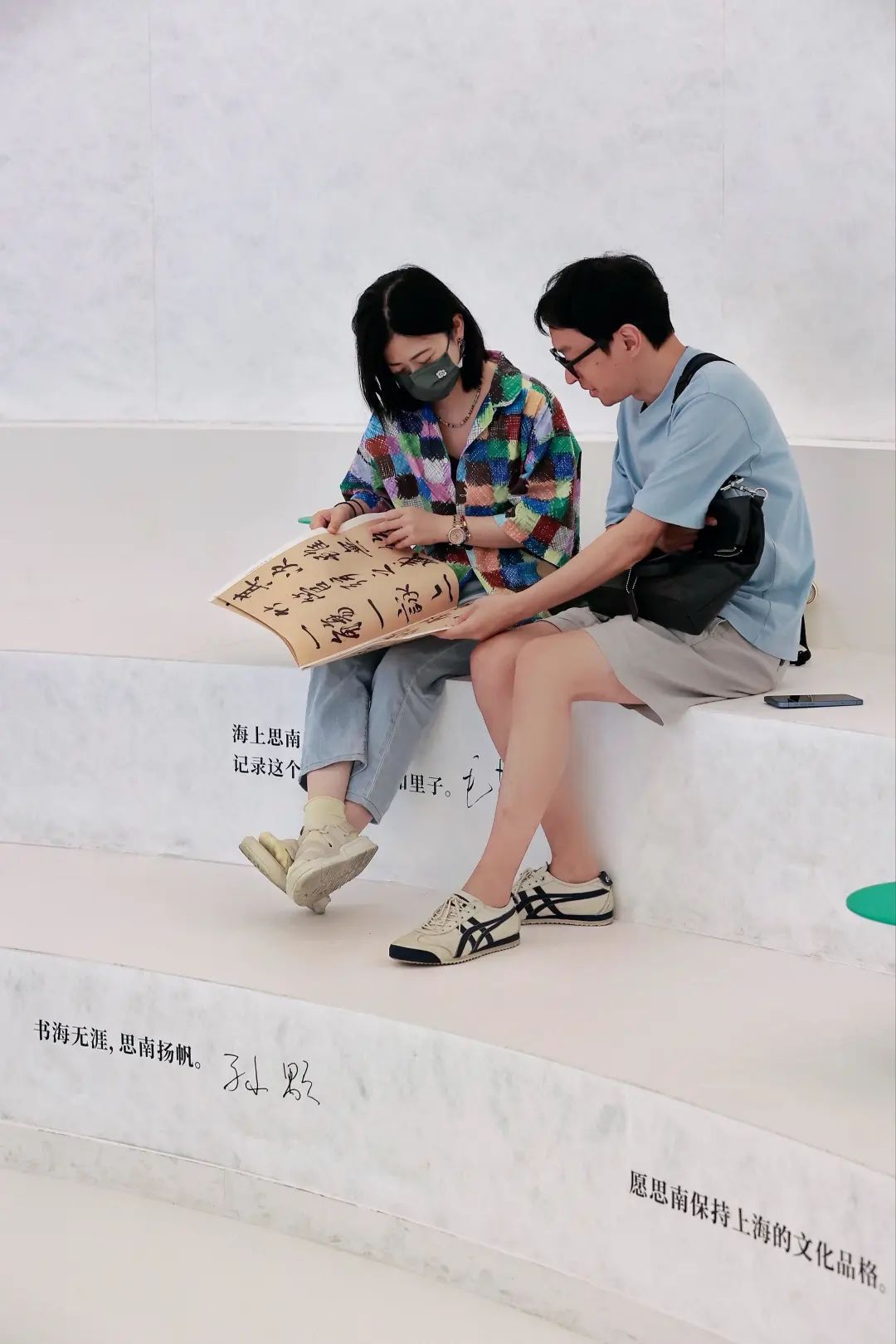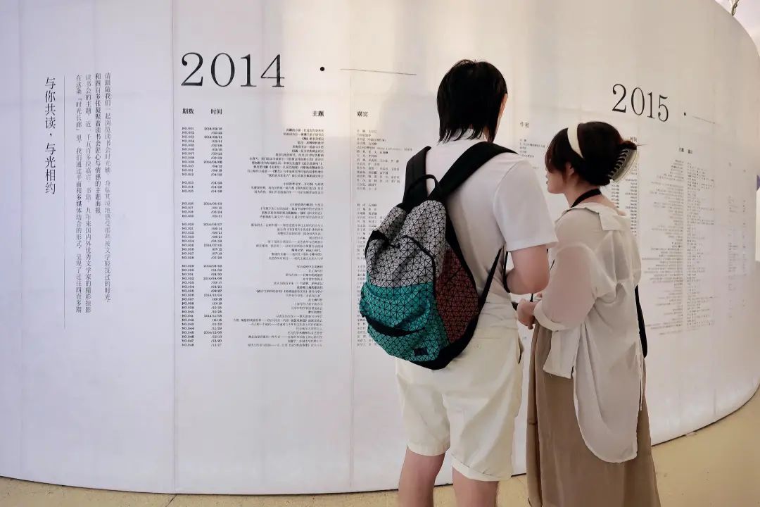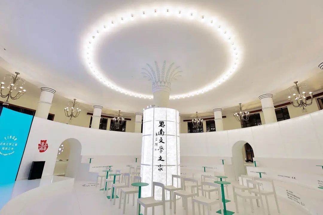 “思南文学之家·阅读之光”在圆厅内嵌入一个白色发光体,旨在创造纯粹的、沉浸的、具有东方美学风格的文学空间。为呼应书展主题,现场采用具有传统宣纸质感的杜邦纸作为主材料。空间中心的光柱,犹如灯塔,寓意文学点亮生活。展陈以思南公馆建筑特色拱门为衔接,传递着上海这座城市以及思南公馆作为上海文化地标中西融合、海纳百川的姿态。正是有如此的超高颜值,“思南文学之家·阅读之光”吸引了一波又一波读者前来打卡。