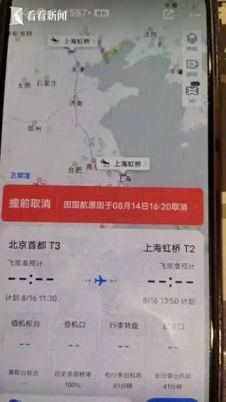 红星新闻记者查询发现,航旅纵横APP显示,该航班原计划8月16日11:30分从北京首都机场T3起飞,13:50分抵达上海虹桥机场,但16日该航班已取消。