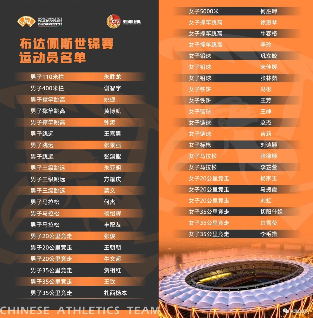 2023年世界田径锦标赛将于8月19日至27日,在匈牙利首都布达佩斯举行。中国田径队此次将派出41名运动员参加17个小项的比赛,其中包括男运动员20人,女运动员21人。