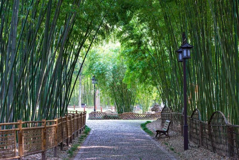 上海共青森林公园的万竹园是都市里一处清幽雅静的观赏竹专类园,位于嫩江路南面。万竹园虽小,但十分精致,小巧玲珑,有着“日出清清秀,月照清清影,雨洗清清秀,风吹清清香”的竹趣盎然之景。