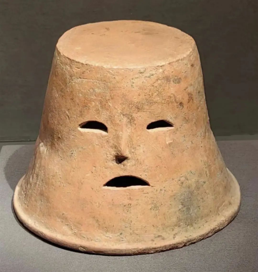 小翘鼻,月牙眼,似笑非笑,这只形似倒扣花盆的呆萌文物来自陕西考古博物馆,名为镂空人面覆盆形器。