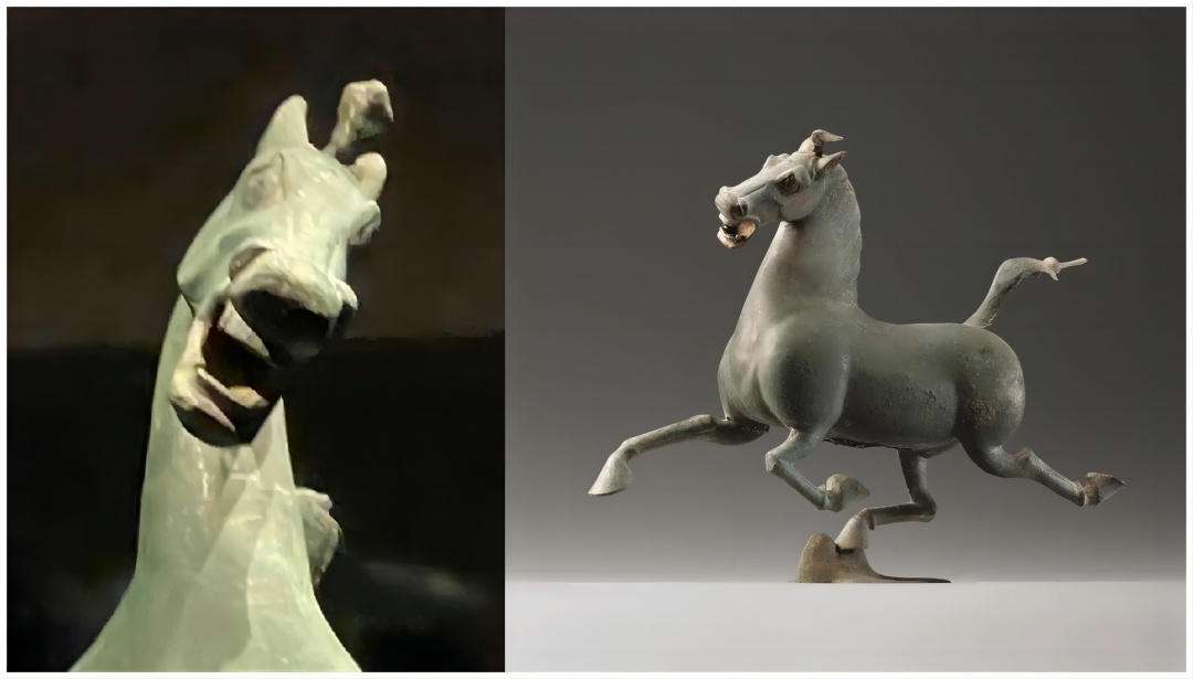 原型铜奔马今夏被众多网友称为显眼包,这匹奔驰的骏马,侧面昂首嘶鸣,躯干线条俊美,“很有点帅”;只是正面侧面“判若两马”。正面的它龇牙咧嘴,憨态可掬,让人忍俊不禁,仔细一看,这位马兄还“有点搞怪,跑起来顺拐!”