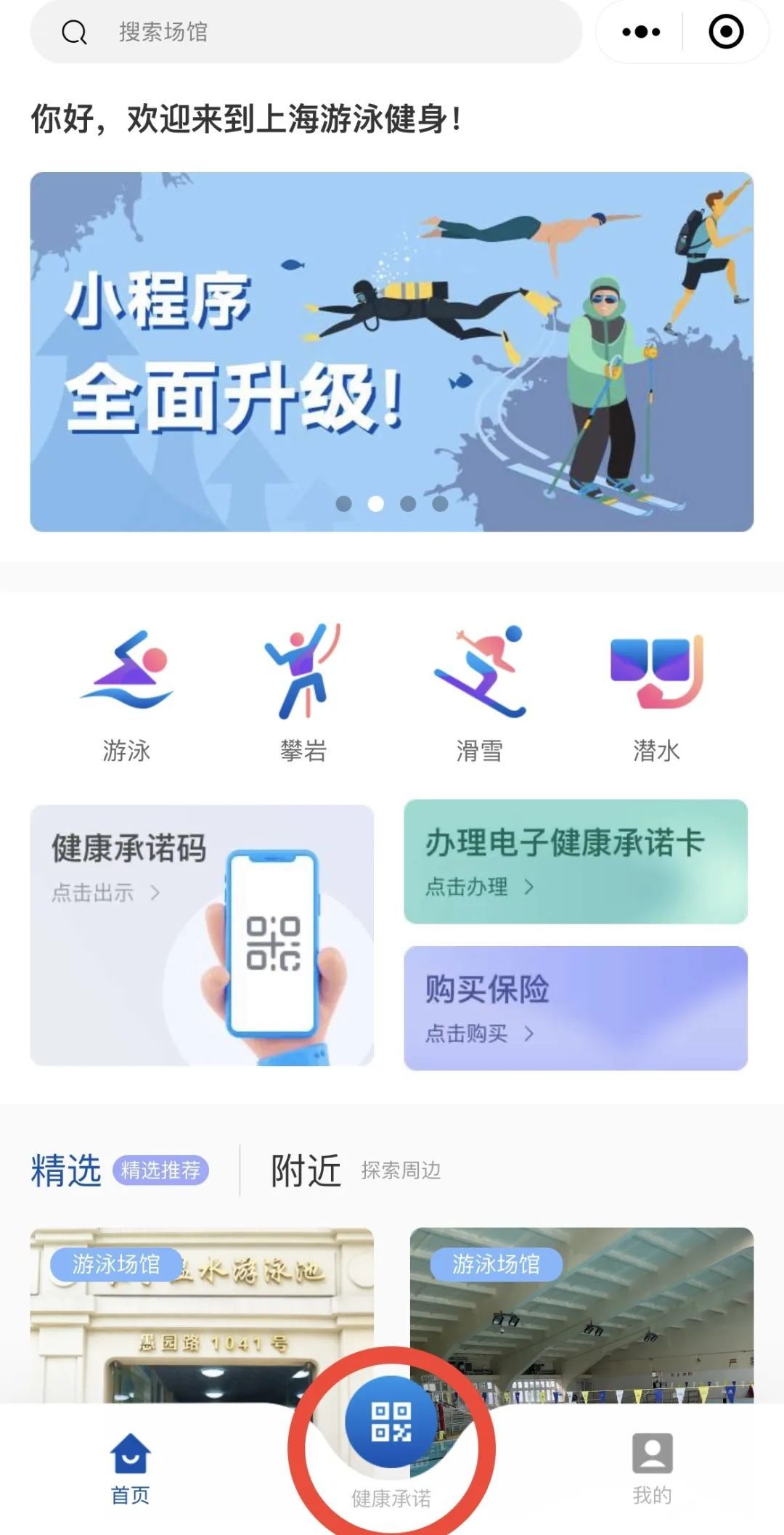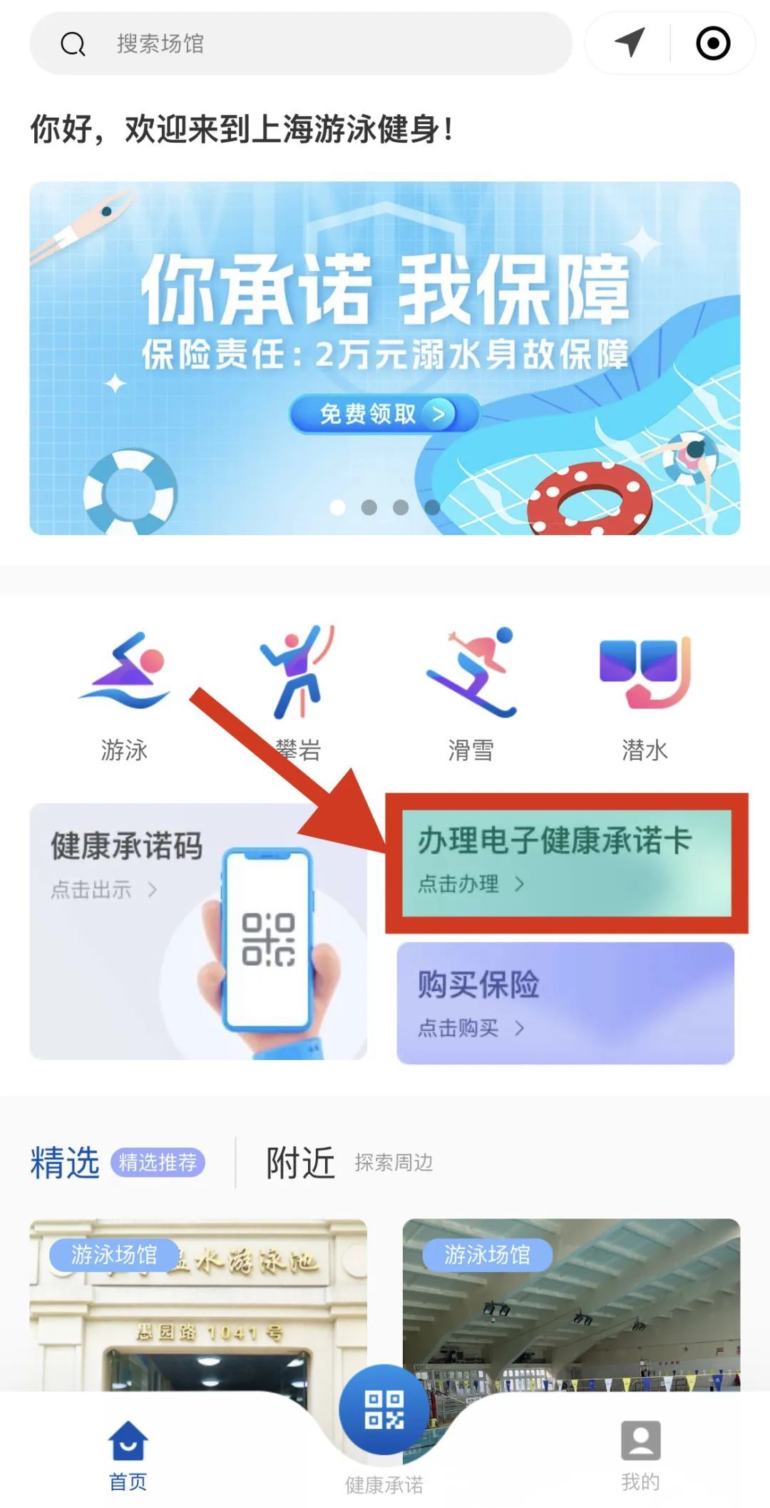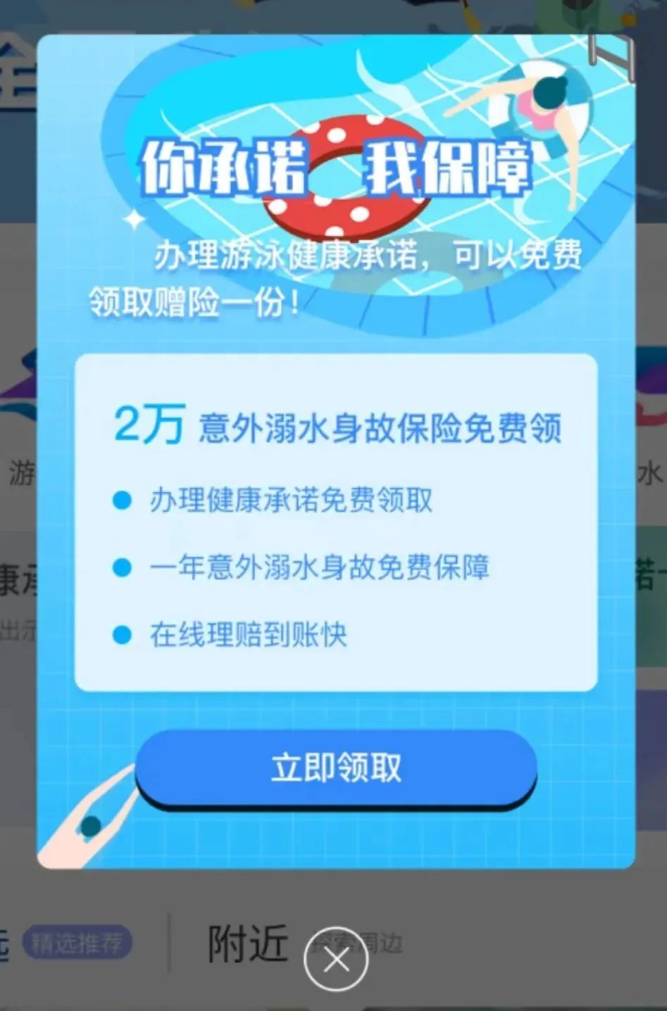 注意:泳客必须选择持证备案场所,并在游泳前核验泳客健康承诺,赠险方能生效。