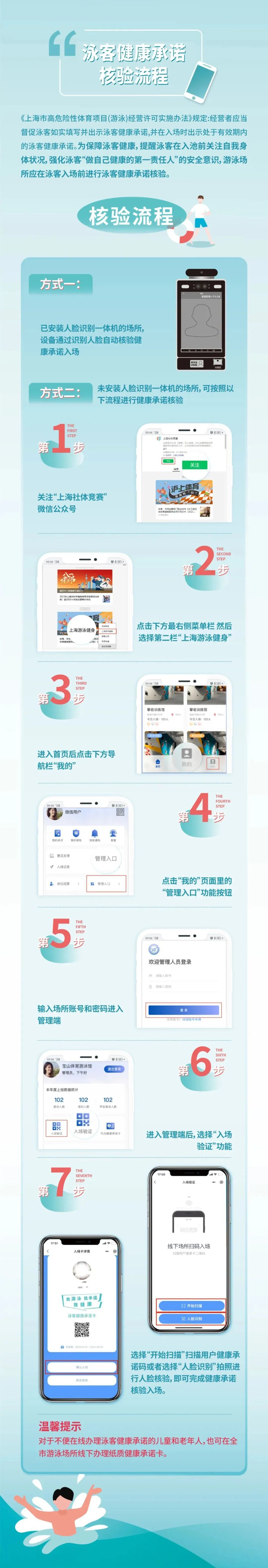 《上海市高危险性体育项目(游泳)经营许可实施办法》第十一条第三款规定:经营者应当督促泳客如实填写并出示泳客健康承诺卡,并在入场时出示处于有效期内的泳客健康承诺卡。