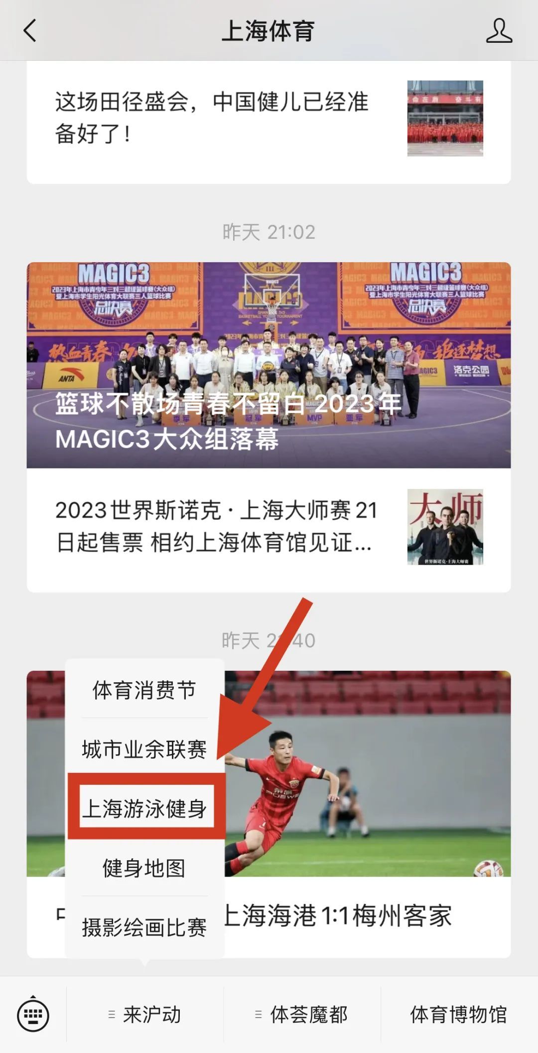 市民可在“上海体育”政务微信或“上海社体竞赛”微信菜单栏中选择“上海游泳健身”小程序进行办理。具体办理流程如下: