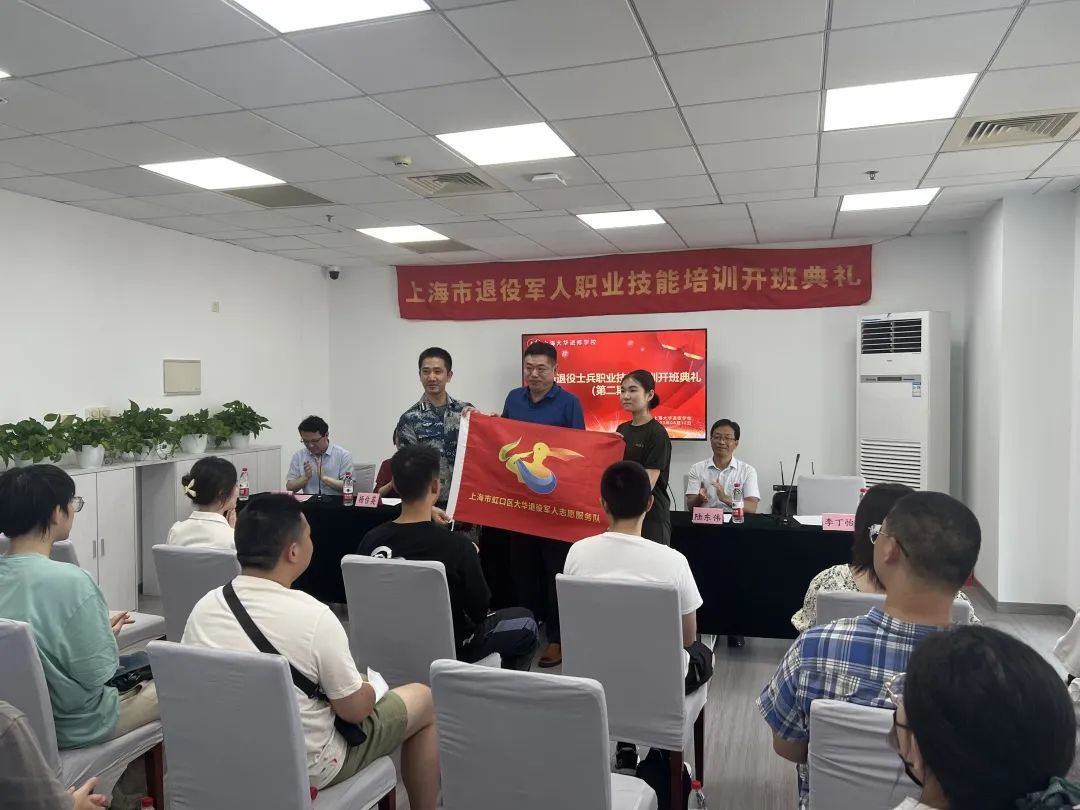 开班典礼上,虹口区退役军人事务局和上海大华进修学校相关负责人分别作了发言,他们鼓励已经报班的退役士兵在培训班上学到真本领,为将来就业创业打好基础。随后,区退役军人事务局为大华退役军人志愿服务队授旗,并向大华咨询集团“退役军人教育培训基地”授牌。