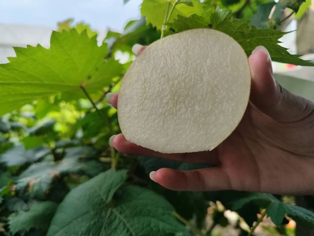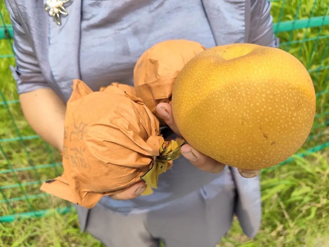 秋月梨梨皮棕黄,皮薄如纸,因圆润饱满的形状宛若一轮满月而得名,是引进日本的杂交梨品种。其果肉无渣,果核小,可食率高,咬一口满嘴都是果汁。秋月梨因其饱满的个头、极佳的口感、丰富的营养,被吃货们赋予“梨中爱马仕”的美誉。“秋月梨的储存期也比较长,放在冰箱里用保鲜袋的话,到春节都不会坏,非常易储存,而且经过冰镇后口感更佳。”汤善姐介绍道。