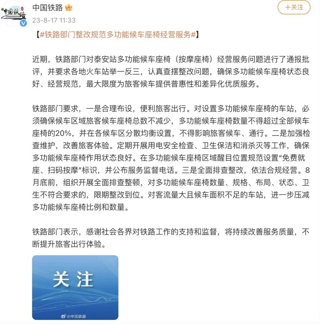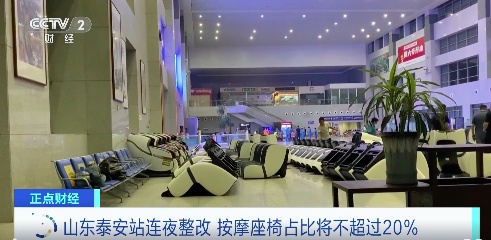 针对山东泰安站、泰山站两个火车站内安装大量共享按摩椅,普通座椅稀少的问题,铁路部门对泰安站的共享按摩椅经营服务问题进行了通报批评,并要求多功能座椅占比不超过全部候车座椅的20%。
