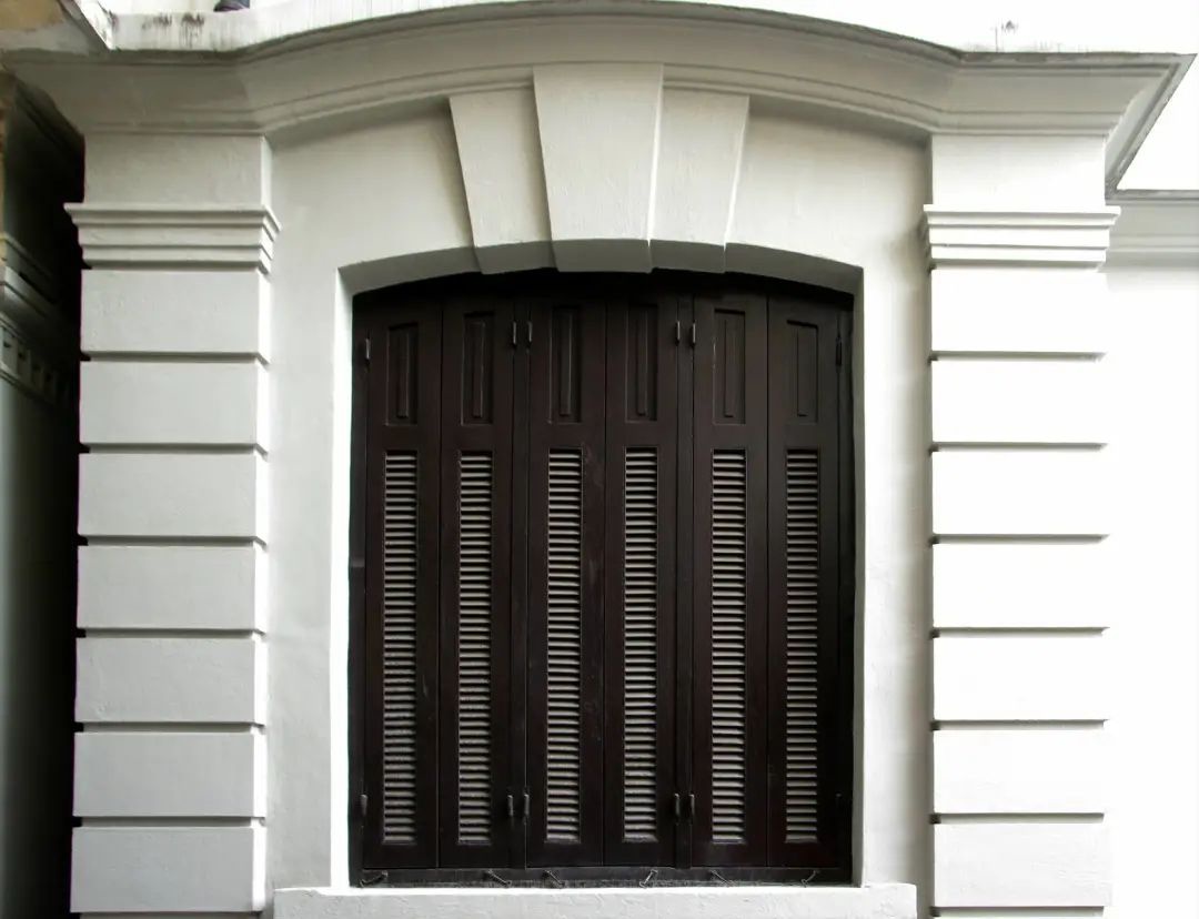 建筑还设计有介于山墙与屋顶窗之间的窗,窗架为短而粗壮的方柱,上面架以平弧顶,窗锁石两侧配以山花图案。
