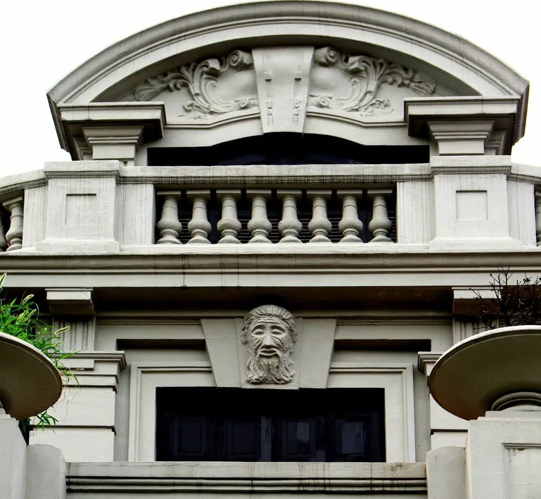 二层栏杆柱上饰花盆,檐下的平拱窗锁石上饰三座人头像浮雕。三层阳台略向后退,曲线形阳台,局部有椭圆雕刻图案,栏杆上的石制花坛呈现出巴洛克风格。
