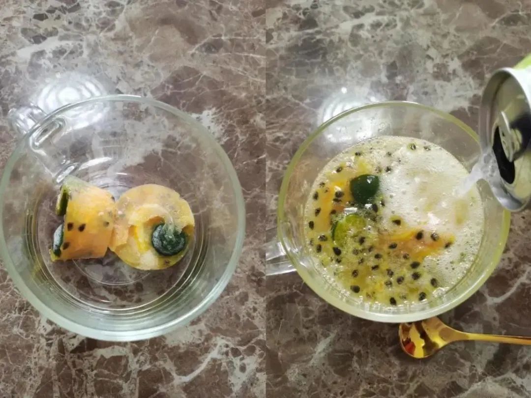 6.准备两个玻璃碗,取两盒冻好的柠檬百香果蜂蜜茶,加入苏打水或矿泉水,一杯健康又解暑的夏季饮品就做好啦。
