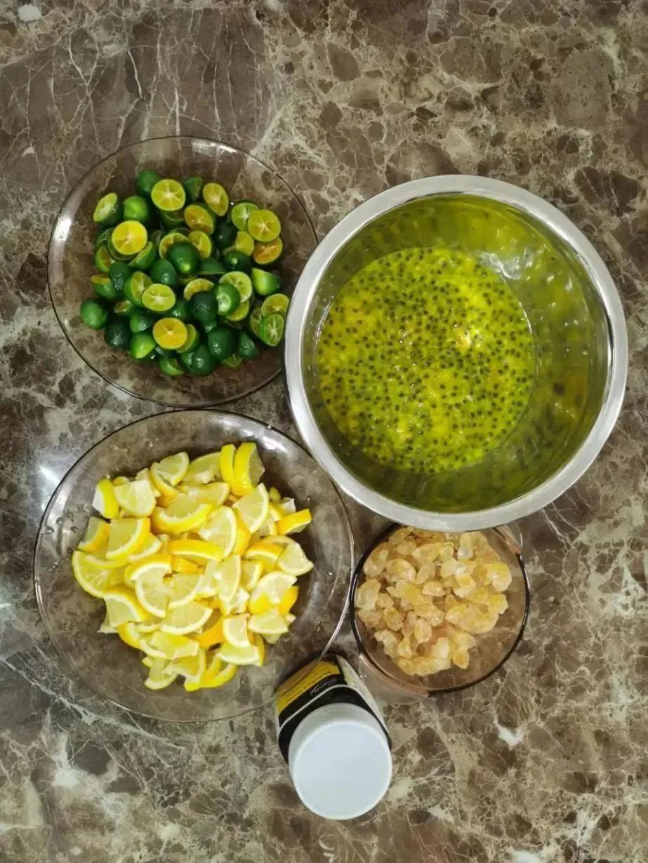 材料:柠檬8个,小青柠300克,百香果16个,食盐少许,黄冰糖300克,蜂蜜100克,空盒40个,苏打水/矿泉水。(可根据实际饮用人数调整配料数量)