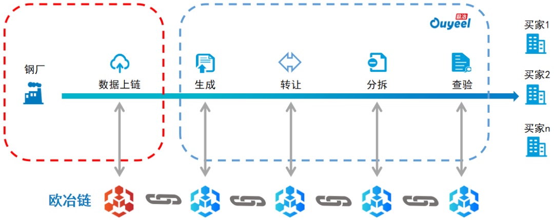 二是通过生态协同,保证产业链安全稳定。产业互联网具有连接、共享、开放、赋能的特征,结合区块链、物联网、大数据等技术应用,可以实现从上游生产到下游使用全流程,货物、资金、信用、交付可视可控和安全。欧冶云商加强区块链技术应用,整合资源成立区块链应用技术研究所,实现“欧冶链”区块链服务平台成功上线,并加强物联网在物流场景中的应用,实现在库、在途全程智能监管。此外,平台提供保供稳价服务,为中小客户规避价格波动风险,实现稳健经营。