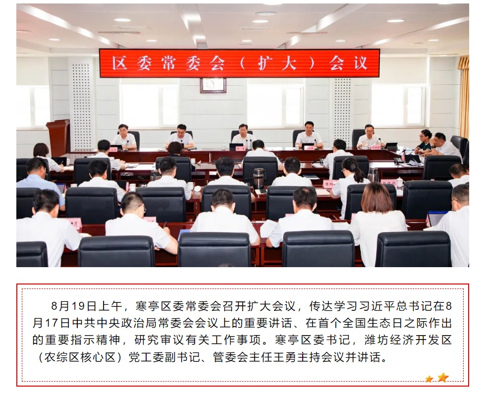 据潍坊市寒亭区委宣传部微信公众号“画乡寒亭”消息,8月19日上午,寒亭区委常委会召开扩大会议。寒亭区委书记,潍坊经济开发区(农综区核心区)党工委副书记、管委会主任王勇主持会议并讲话。