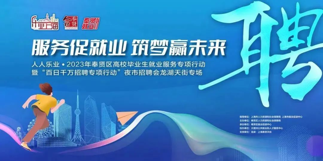 一、活动主题 服务促就业 筑梦赢未来 二、活动时间 2023年8月22日晚17:30-19:30 三、活动地点 龙湖天街室外一楼 (奉贤区金海公路3800号) 四、组织机构 指导单位: 上海市人力资源和社会保障局 上海市就业促进中心 主办单位: 奉贤区人力资源和社会保障局 承办单位: 奉贤区就业促进中心 协办单位: 大理州公共就业和人才服务中心 支持单位: 龙湖·上海奉贤天街 五、服务对象 1、2023届高校毕业生; 2、往届有就业意愿的离校未就业高校毕业生; 3、35岁以下未就业青年; 4、有招聘需求的各类企事业单位。