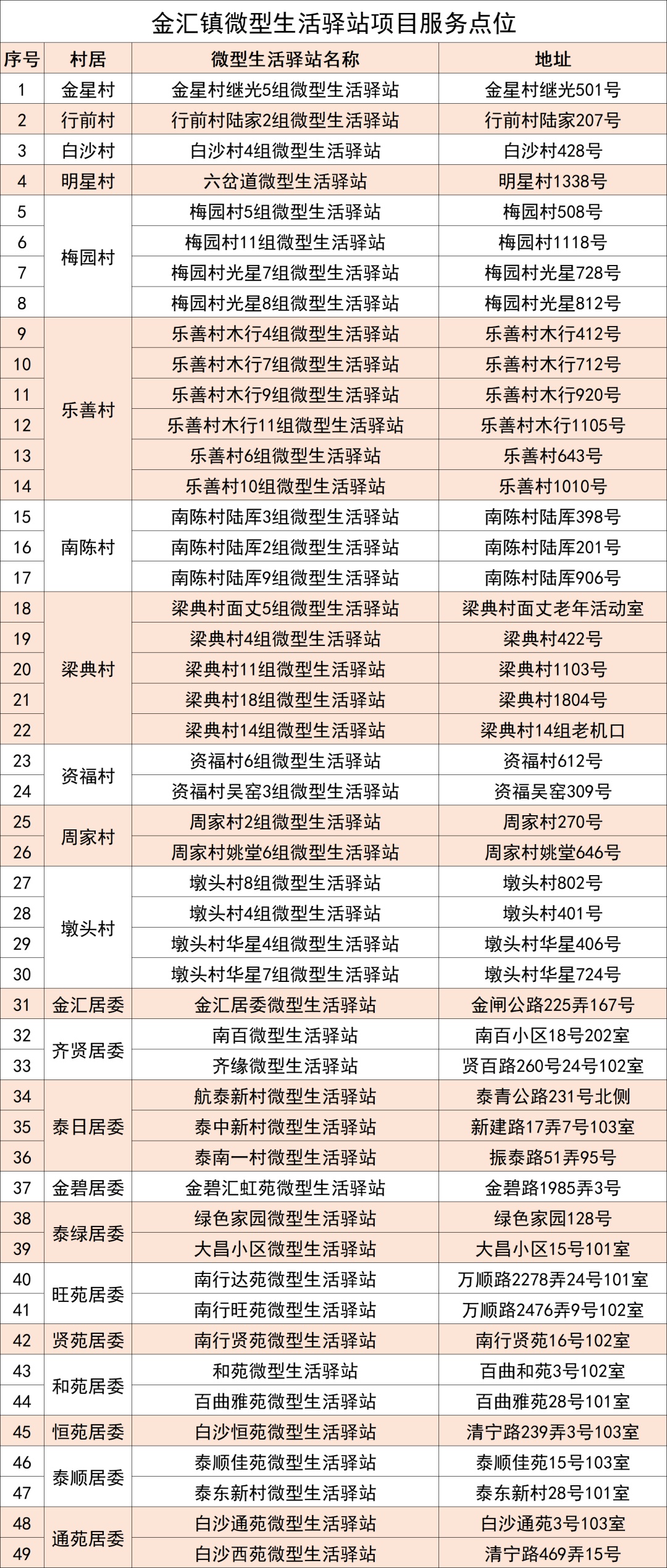 在社区里,有这么个地方总是热闹非凡,金汇的爷叔阿婆们都爱去。一间宽阔整洁的屋子内,摆上两三张桌子、几把椅子,白墙上则张贴有宅基课堂介绍、党员风采、志愿者服务项目等,附近的村居民们聚集在一起其乐融融。 “我们老人平常在家也没啥事情做,村里跟我们宣传说有个地方可以聊聊天、看看戏,我们就过来参加了。上次端午节还一起包了粽子,蛮好的!”其实,这个“神秘之地”就是隐藏在社区里的微型生活驿站。 微型生活驿站是连接社区群众的温馨小家,通常会开在宅基、居民楼里。同时,一个村委或居委可能开设多个微型生活驿站,比起睦邻四堂间、规模性的驿站来说,它们离村居民的家更近,也就更加方便他们就近参加,在“家门口”感受生活乐趣。 为进一步打造“15分钟社区生活圈”,金汇镇以群众需求为导向,以便民、惠民为目标,在全镇各村居推动建设微型生活驿站,提供为老服务、便民服务、党建服务、文化休闲、议事议政等功能。 向上滑动查看更多 今年已是金汇镇微型生活驿站建设投入使用的第5个年头。4月,金汇镇更是在已建成的49个微型生活驿站(不含规模型驿站、睦邻四堂间)正式启动项目植入服务,有效整合各项资源,凭借专业团队和良好服务模式,让驿站发挥更好的作用。 按照服务项目总体计划,在微型生活驿站开展主题服务、便民服务2个特色项目。