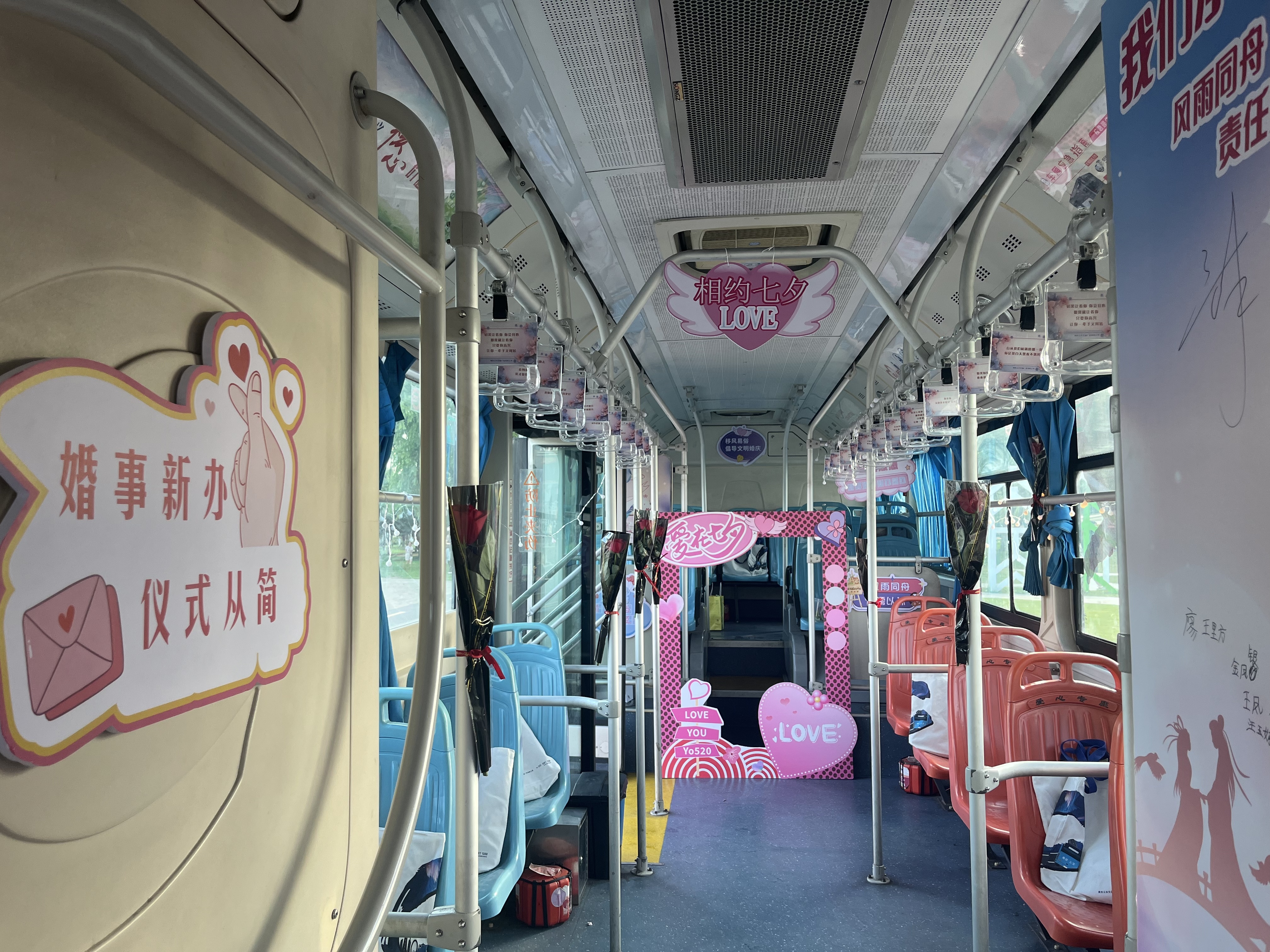 据悉,南京公交3路、34路、26路还各推出一辆以粉色为主色调的“浪漫七夕”快闪巴士,车内装饰鲜花、灯带及文明婚俗新风倡议的展板。近期“浪漫七夕”快闪巴士在鱼嘴湿地公园、建邺区民政局及情侣园门口巡展,可供游客及市民拍照打卡,同时游客及市民可通过扫描车内活动宣传广告栏中的二维码进行留言,南京公交将挑选留言在公交车载视频上进行展示。