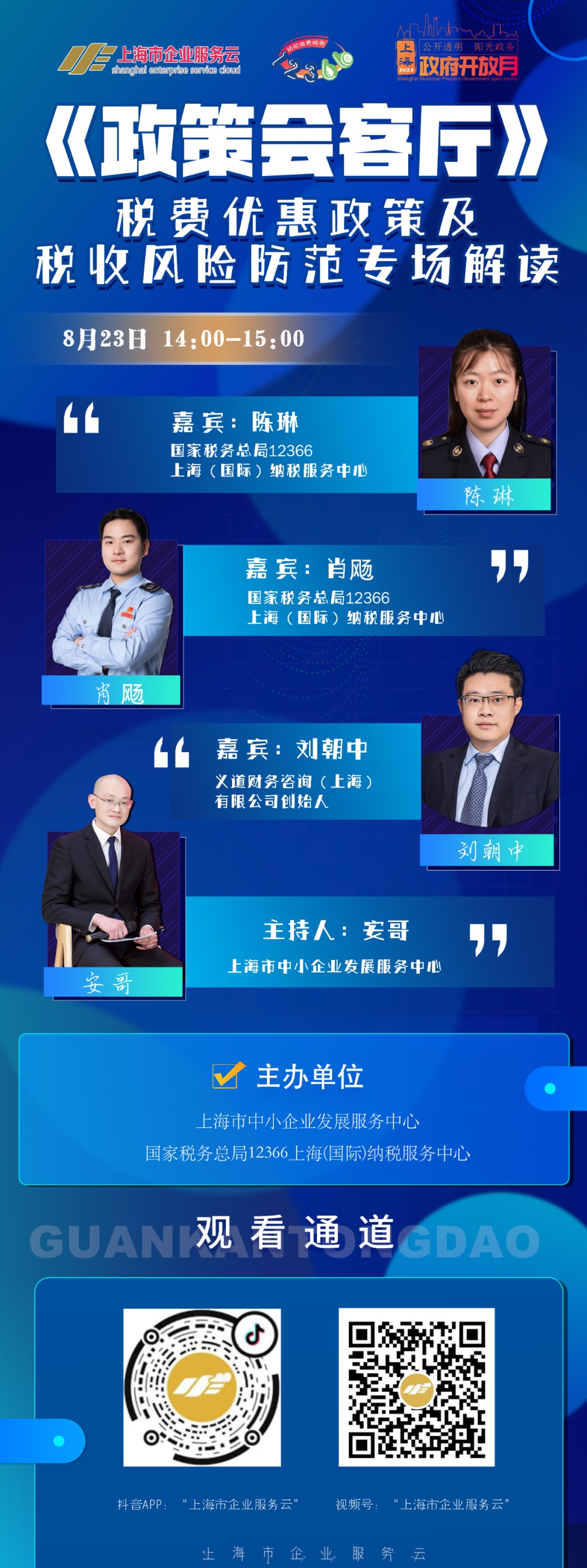 为贯彻落实党中央、国务院部署,进一步加大对小微企业和个体工商户的税费优惠力度,提振企业信心,稳定市场预期,持续激发经营主体活力,财政部、税务总局等部门近日发文,延续优化完善一系列税费优惠政策,上海市中小企业发展服务中心联合国家税务总局12366上海(国际)纳税服务中心共同举办直播活动,解读税费优惠政策及税务风险合规实务相关内容。活动通过上海市企业服务云《政策会客厅》栏目举行。