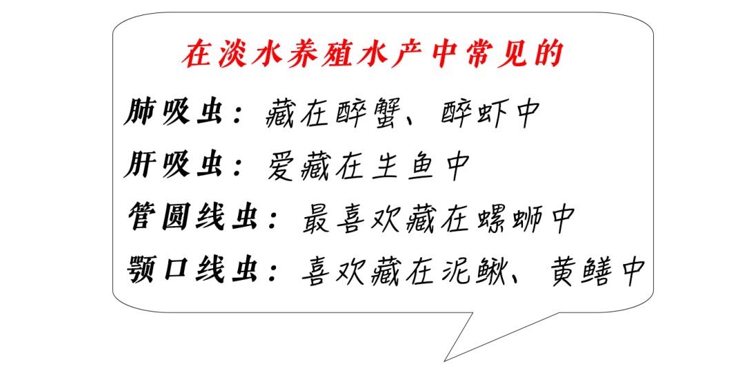 淡水养殖水产很容易携带阔节裂头绦虫、肺吸虫、肝吸虫、颚口线虫等。
