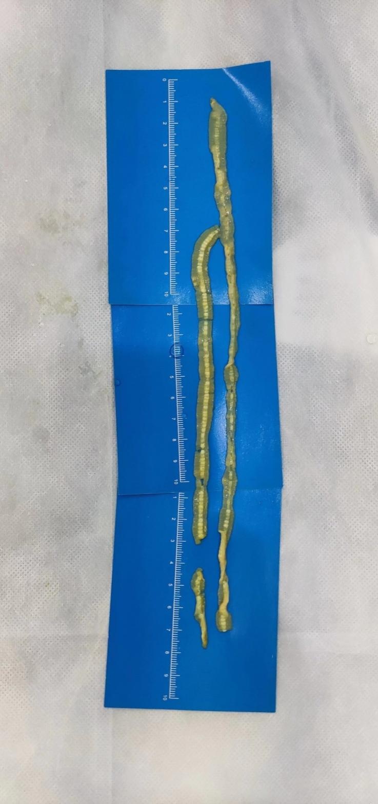 章医生尽量抓取寄生虫,太长了,真是太长了,最终取出60cm。