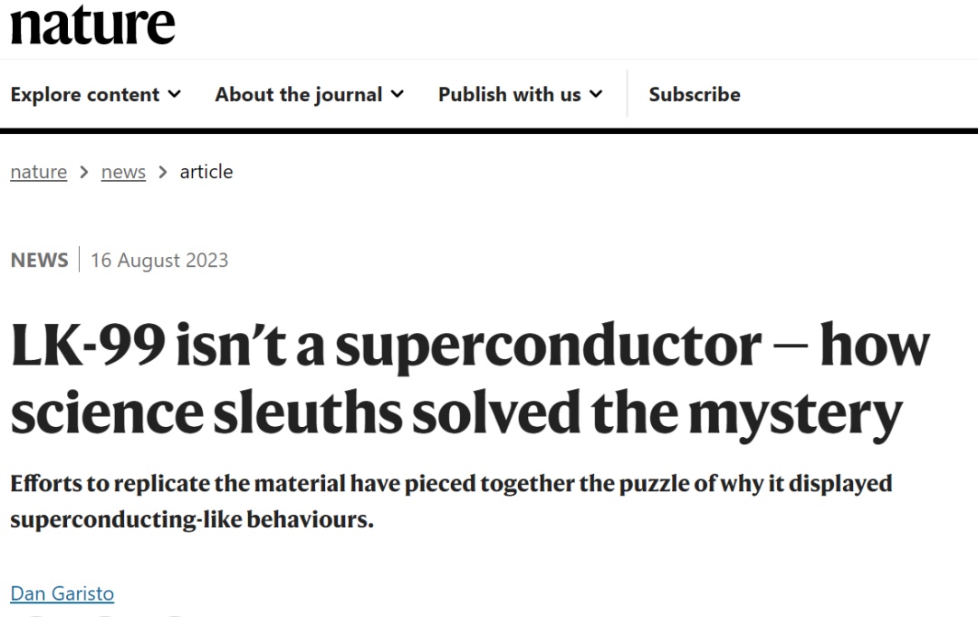 近日,《自然》发文报道:《LK-99不是室温超导体——科学侦探如何解开这个谜团》。该文由曾在费米实验室工作的科学作家Dan Garisto撰写,系统梳理了近期关于室温超导反转事件的研究结果,“研究表明,材料中的杂质——特别是硫化铜,是其电阻率急剧下降和磁铁上部分悬浮显示的原因,其特性类似于超导体所表现出的特性。”