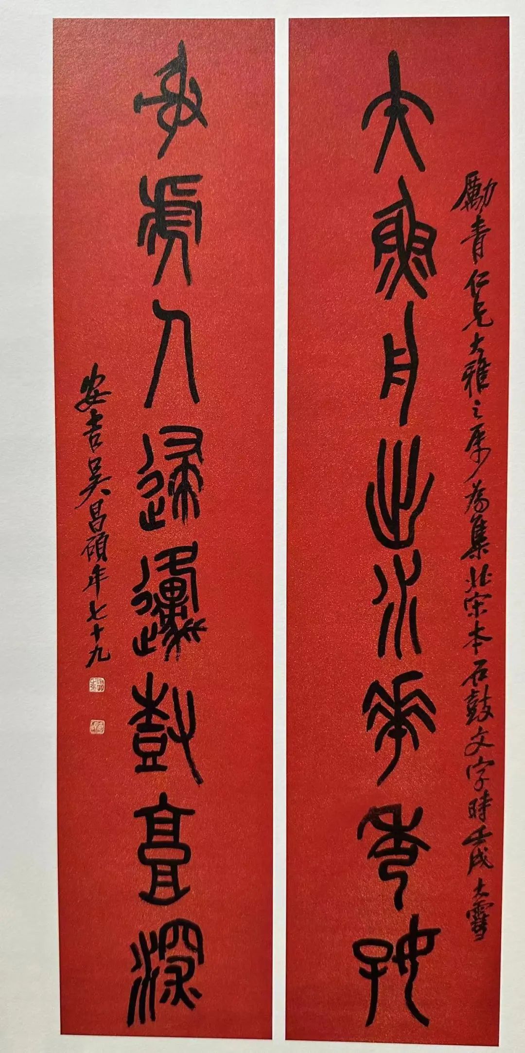 左:吴昌硕《八言对联》篆书 167×36cm×2