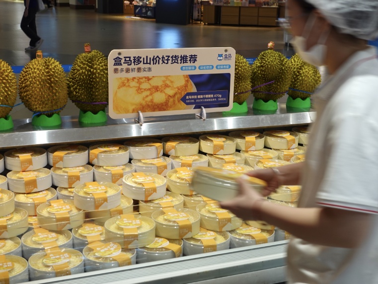 在静安一家盒马鲜生门店内,记者看到,目前在售的盒马日日鲜牛奶、美国精选级肥牛卷、挪威三文鱼、榴莲千层蛋糕等产品的价格几乎为“历史新低”。盒马方面透露,网红单品榴莲千层蛋糕,在过去的近一个月里,销量环比增长了11倍。