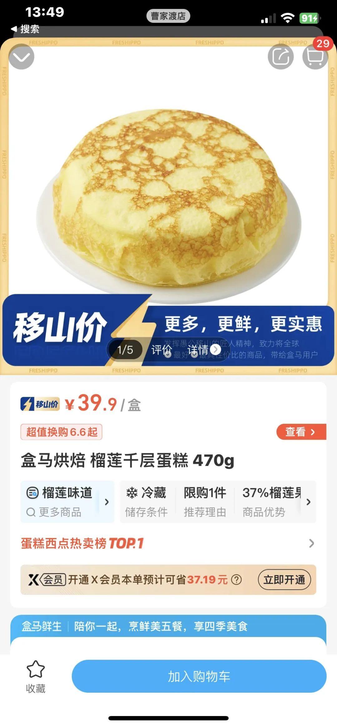 随着活动的进行,盒马也在21日起连续放出大招——网红榴莲千层蛋糕免费送。盒马X会员店推出“移山登场,榴莲忘返”活动,在8/21—8/23 期间到店消费单笔实付金额满499元,可领榴莲千层蛋糕赠品优惠券1张(礼券使用时间9/1—9/7),单店每日限量100份。