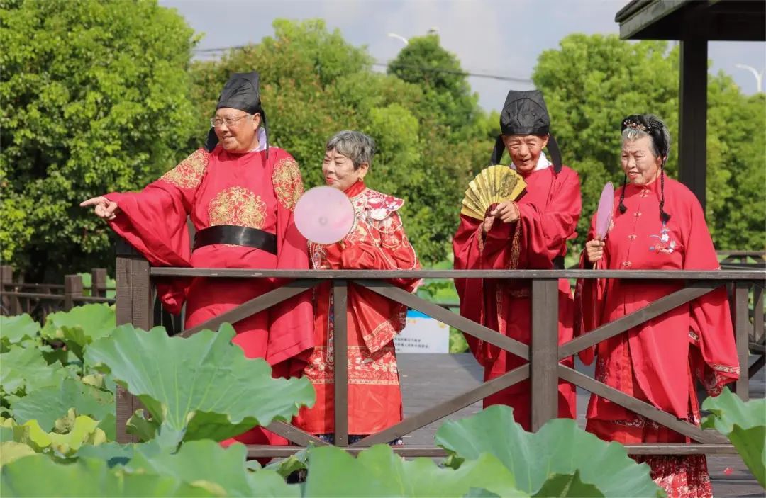 在“四堂间”故事之“七夕幸福时光”主题活动上,爷叔嬢嬢们换下平日里的便服,换上了凤冠霞帔,伴随着习习凉风送来盛开的荷花香气,携手漫步游园。