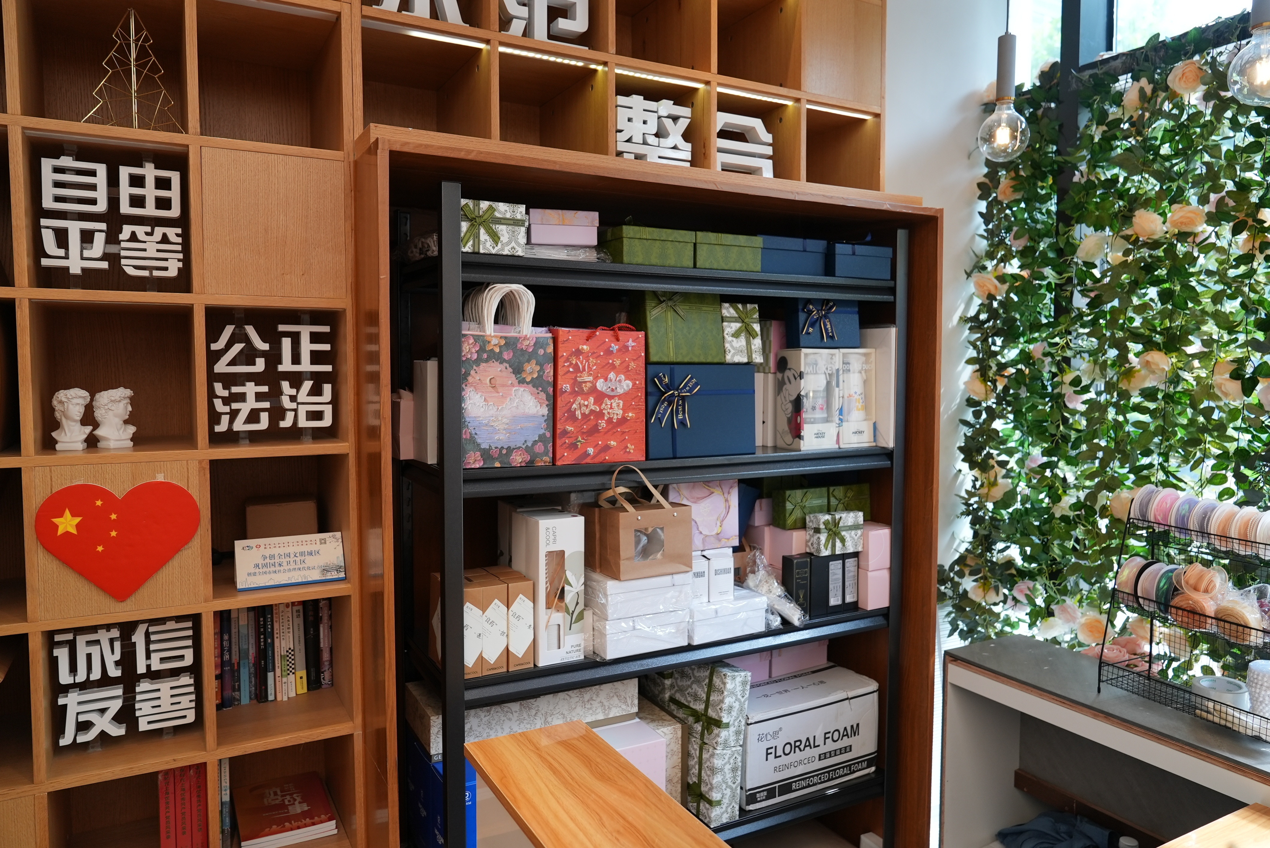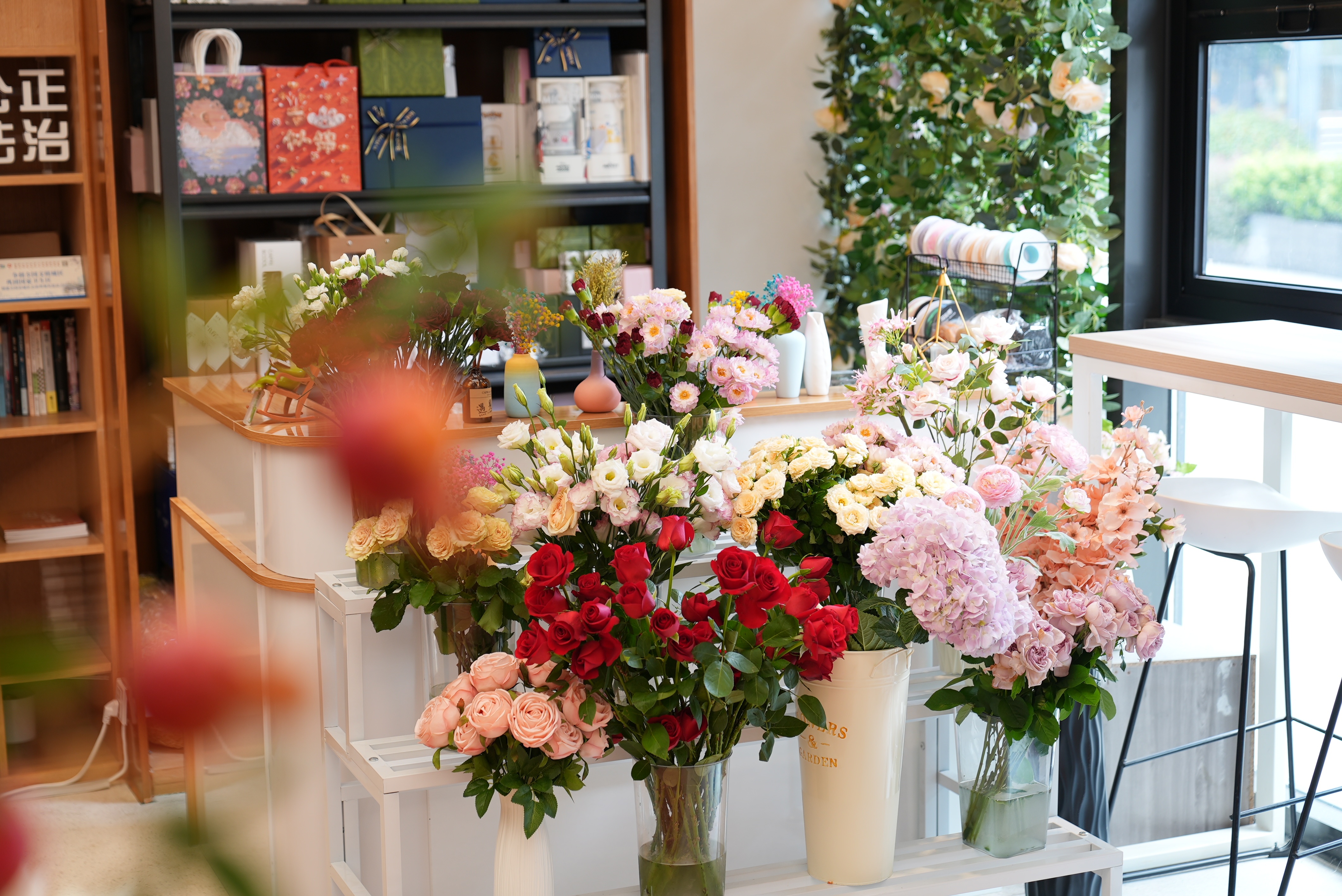 红玫瑰、粉玫瑰,还有康乃馨、绣球花……走进位于中江路875号怒江党群服务中心的“啰匠”花店,不少市民被入口处琳琅满目的花束装扮深深吸引,姹紫嫣红的花束被设计出雅致造型,摆在精心设计的展台上,散发出阵阵芬芳气息。