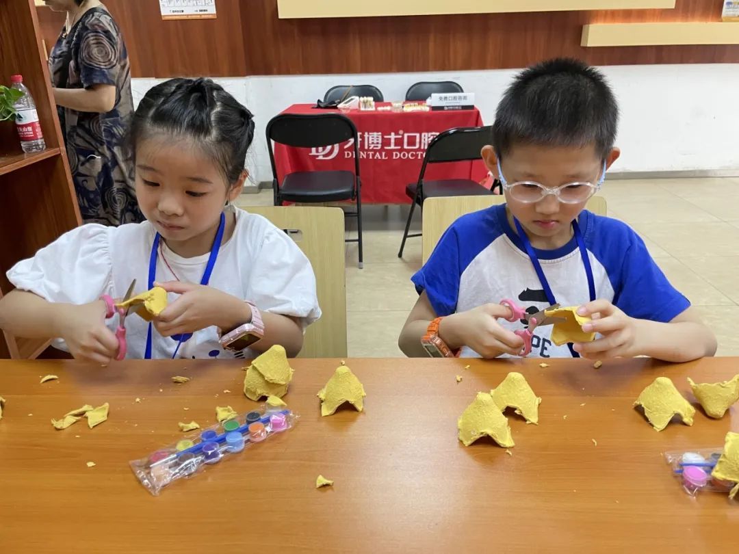 随后,“小小网格长”们开始了一场“变废为宝——蛋托小风铃”创意手工,孩子们发挥自己的奇思妙想,将废旧蛋托涂上喜欢的颜色放在旁边晾干,脑中构思着自己想做的风铃图案。