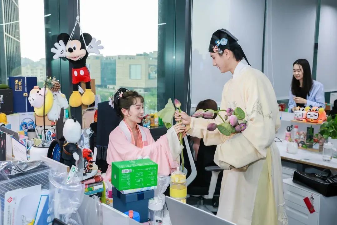 汉服是中国传统文化的重要组成部分,记者看到,活动现场有许多员工身穿不同朝代和种类的汉服,穿梭在各个活动区域,令人不免感觉像穿越到了古代,营造出一种唯美浪漫的氛围感。