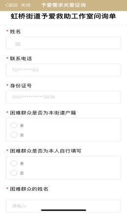 于是,虹桥街道探索拓宽线上社会救助的新路径,即困难群众可以通过随申办“予爱救助”服务模块中的“政策指南”,随时了解救助政策,对比自己是否符合申请条件,并通过“予爱需求关爱征询”,在不出家门、确保个人隐私的条件下反馈自己的实际困难,向救助工作者发出“求救信号”。