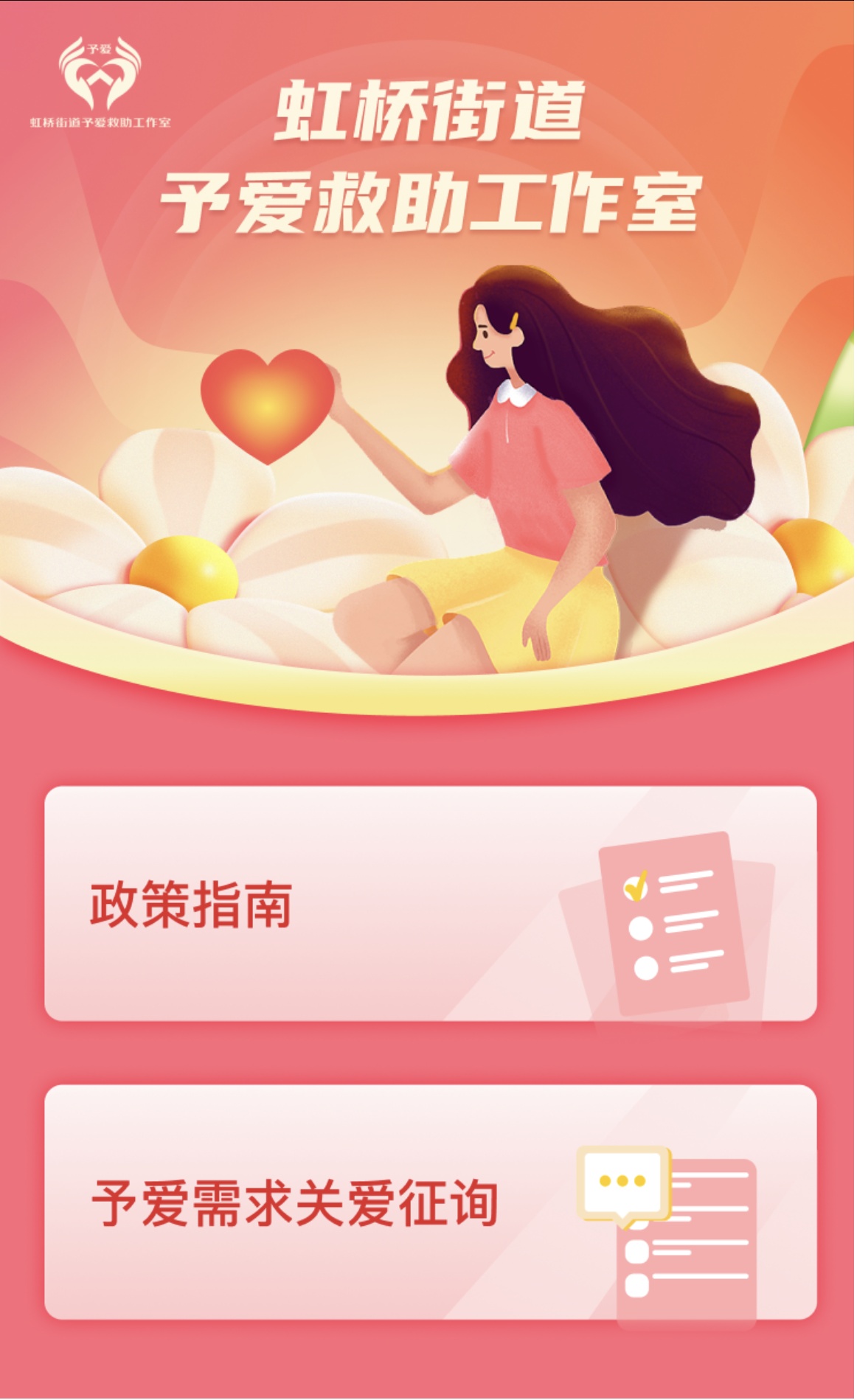 为进一步提高社会救助政策知晓率,拓宽困难群众诉求及发现渠道,打通困难帮扶的“最后一公里”,虹桥街道在“随申办”市民云虹桥街道旗舰店推出了“予爱救助”服务模块,这也是全市首个线上社会救助工作室。