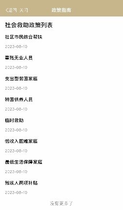 “政策指南”中发布了“最低生活保障家庭”“临时救助”“特困供养人员”等多项救助相关政策,并实时更新。