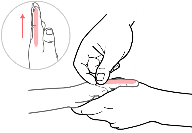 操作:操作者一手持患儿拇指,用另一手拇指或食指、中指自患儿掌根推至拇指根部,可推100—500次。