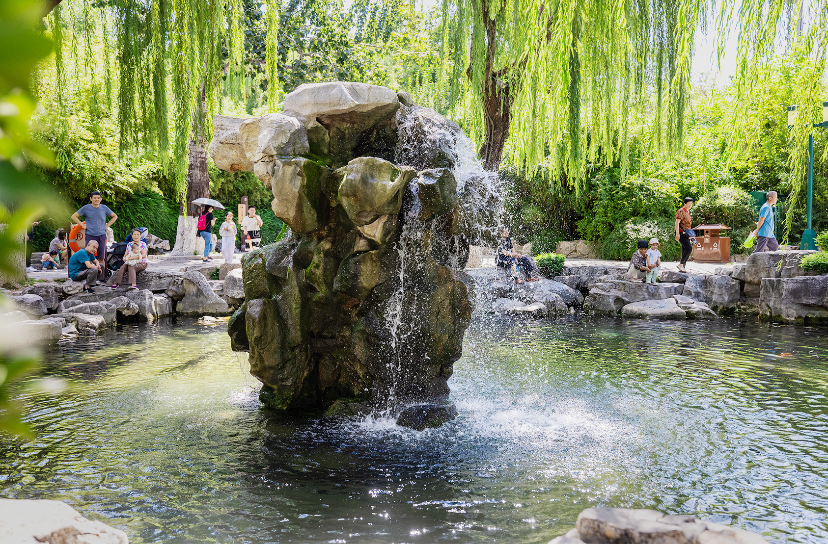 几场雨后,济南五龙潭的月牙泉呈现出醉人的容颜,泉水由石窦上端激出,水花四溅,顺势而下,如飞瀑一般,形成泉中之泉的“月牙飞瀑”奇观。泉边风吹垂柳,水底锦鲤游弋,引得众多游人前来观瞻。