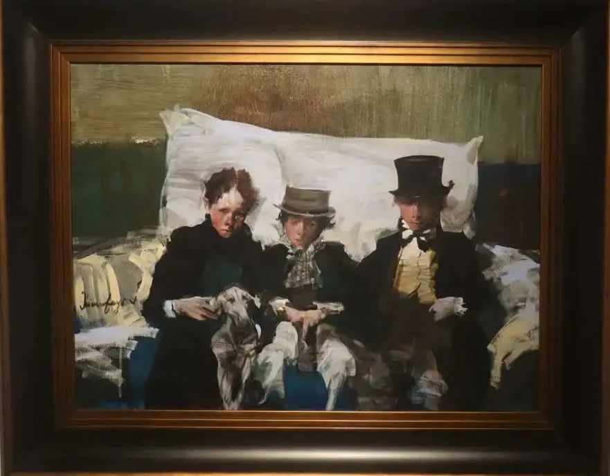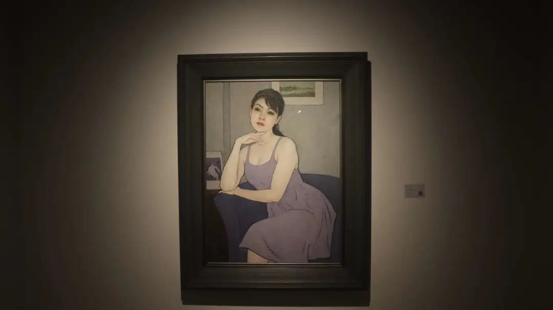 原中央美术学院院长,中国美术协会主席靳尚谊的作品《青年演员》被设置在展览的入口处。画中,一位身着紫色吊带裙的青年女演员坐在沙发上,姿态优雅,神情宁静,似在沉思。画面中的线条处理、光影弱化、以及碎碎点上的笔触,都自中国画技法演变而来,体现了作者对中国油画的探索思考。