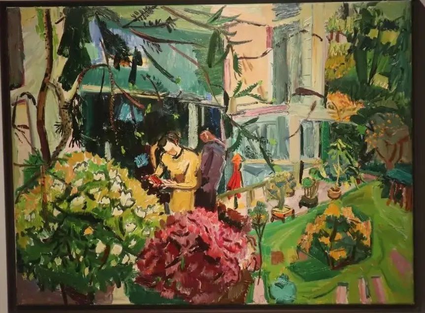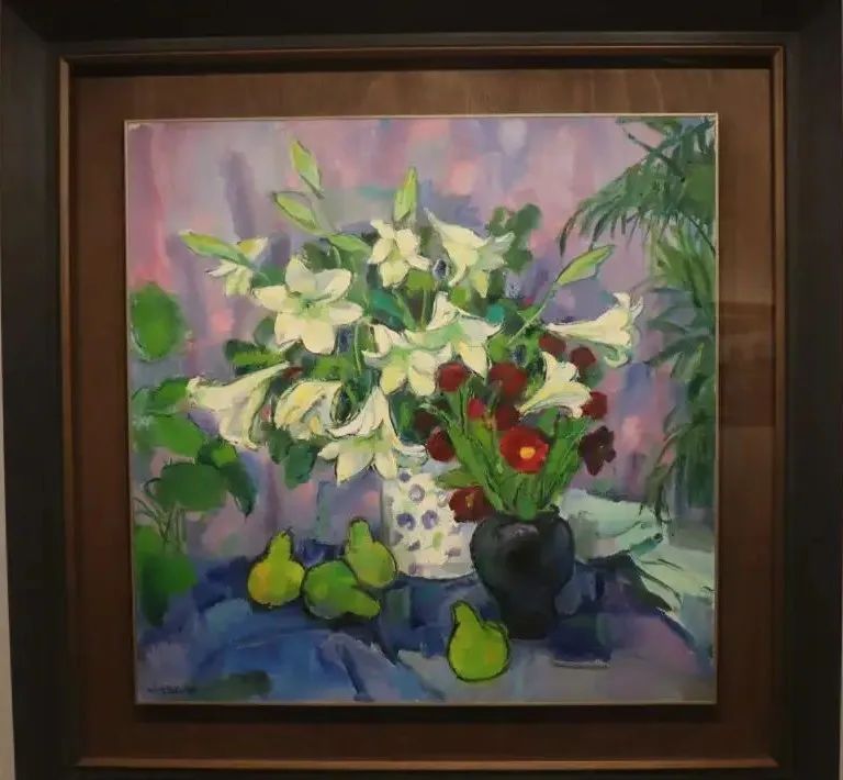 在展厅中,画作《百合花》格外引人注目。这幅作品是海派画家陈钧德先生的手笔。它的色彩鲜明,百合花形态自然,传递出一种静谧美好的感觉。陈钧德被中国评论界誉为“中国写意油画成功的范例”“中国油画的色彩大师”,其画作颜色亮丽明度高,兼容西方油画从古典到现代的各类创作技巧,个人风格鲜明。这幅《百合花》写意意味浓厚,以简洁的线条勾勒出物体的形式、体感、美感、质感,具有中国特色。