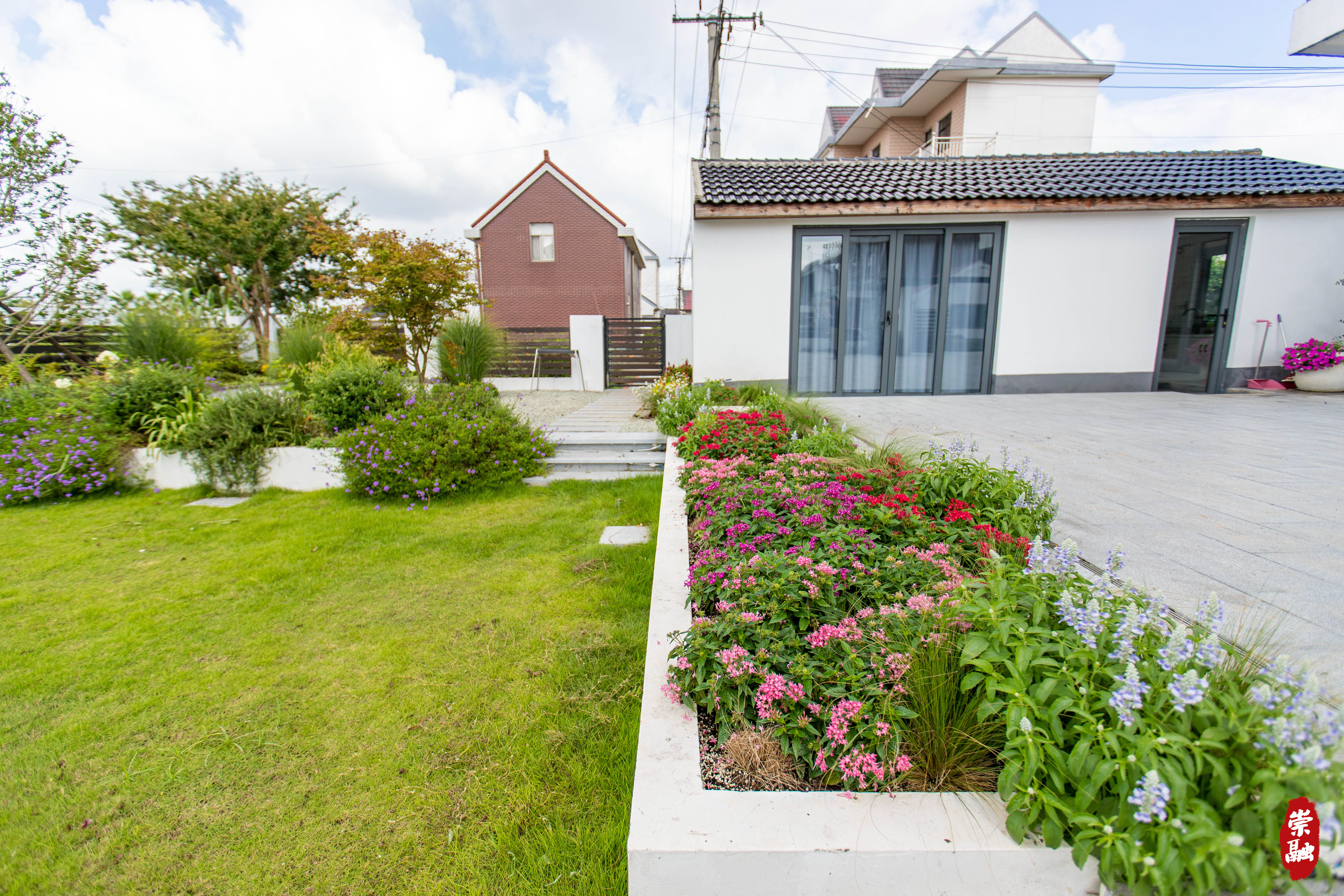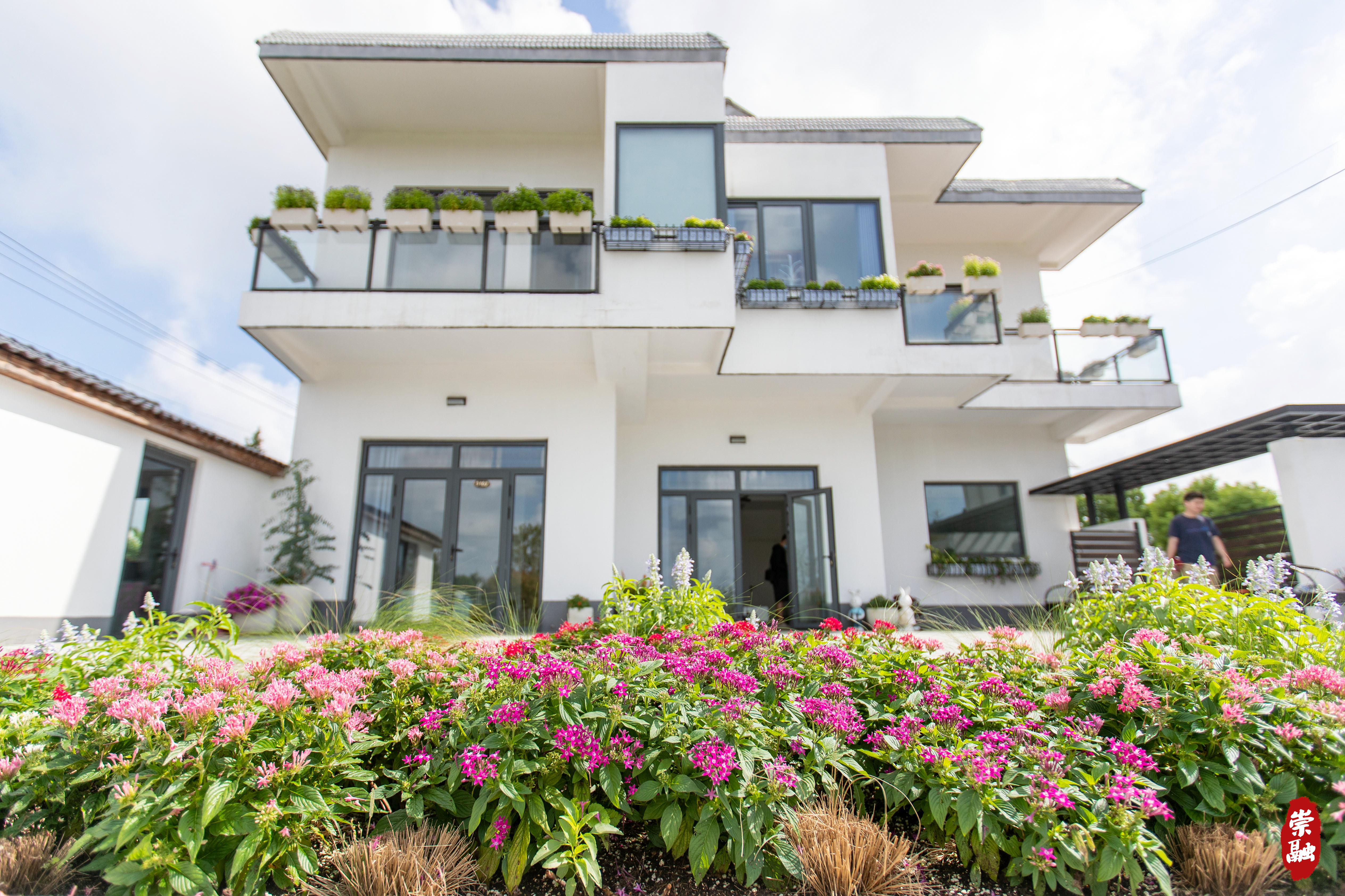 在公司园区北侧,坐落着十余栋白墙灰瓦的民宅,院落和阳台上被各种鲜花围绕和点缀,引得路人纷纷驻足。自去年开始,源怡公司在合兴村启动民宿建设,对向阳河以南的4栋民宿、共20余个房间进行了修建和绿化景观改造,目前经营状况良好,吸引不少市民前来赏花打卡。源怡公司希望通过打造民宿样板,结合南侧智慧生态花卉园的引流效应,带动更多村民通过乡村旅游服务增收致富。