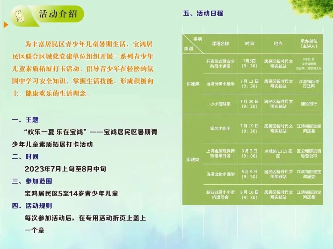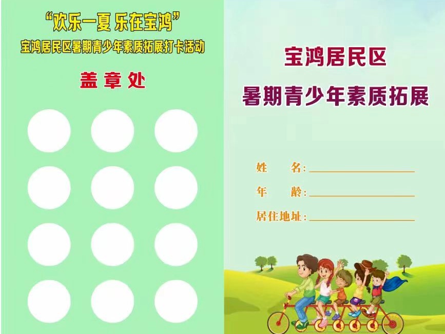为了增加社区青少年的参与性,宝鸿居民区还设计了一张“欢乐一夏 乐在宝鸿”的暑期青少年素质拓展打卡活动,上边既清楚地列出了暑假里所有活动的详细介绍,同时也预留了盖章打卡处,让孩子们的参与性和趣味性更强了,快来看看他们趣味多多的暑期精彩瞬间吧!