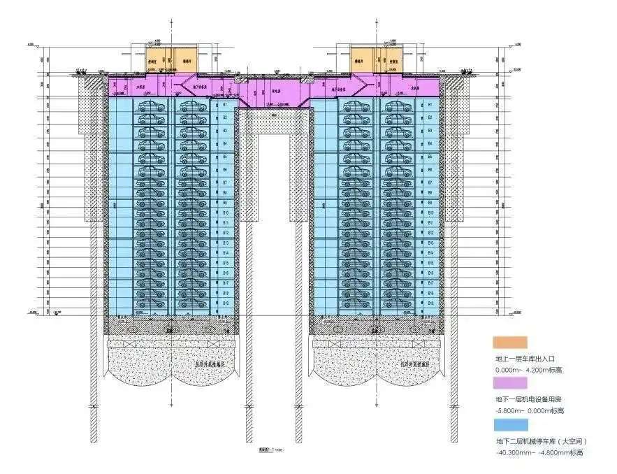 地上一层构筑物为智慧车库出入口及管理设施,占地面积286平方米;地下一层为设备层,地下一层以下为地下停车设备层,采用19层钢结构设计,利用PCS型垂直升降立体机械停车,运用托盘式停车搬运技术和手机APP预约、AGV自动存取车搬运设备,单车平均存取车时间90秒,是集设备、操作、监控、维保、管理智能化于一体的现代化智慧车库。
