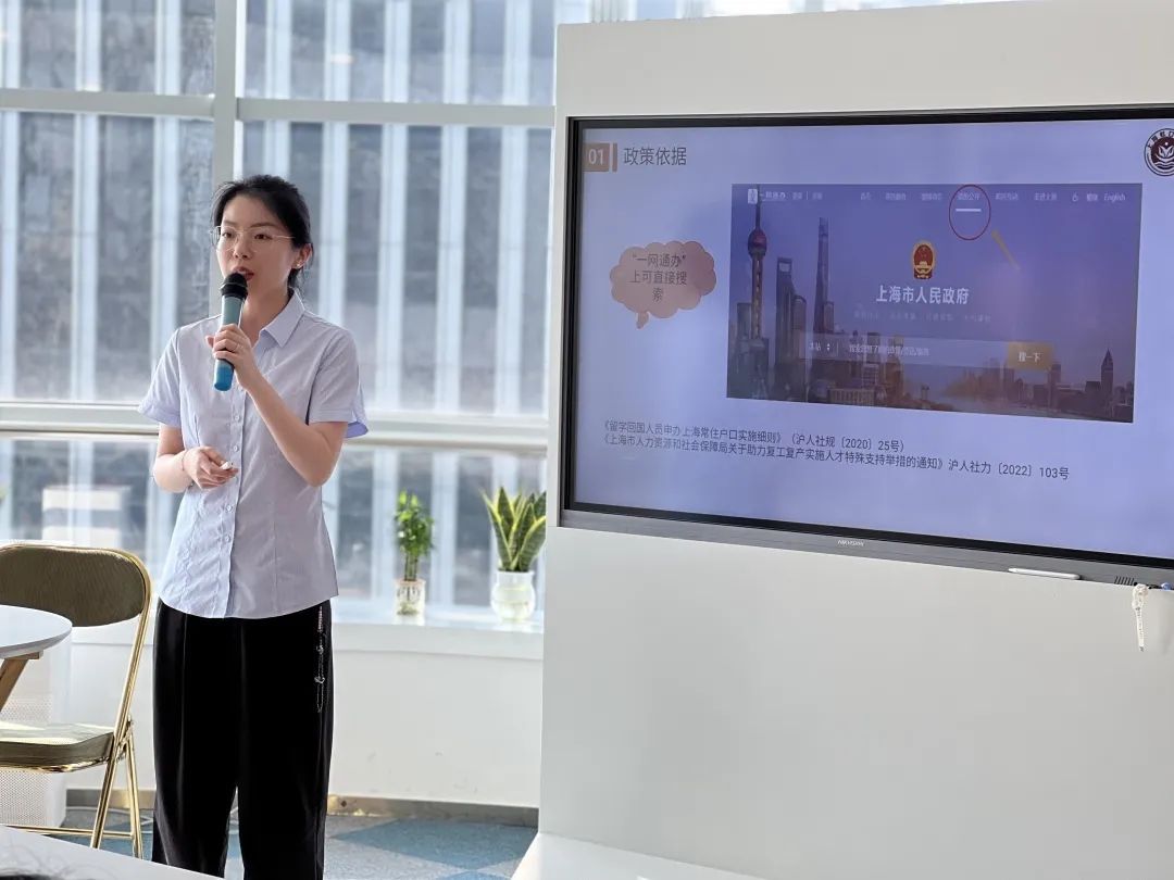 活动还将留学生落户政策与职称申报工作相结合,由区人才服务中心的海外人才服务专员汤璐作留学生落户的政策简介。