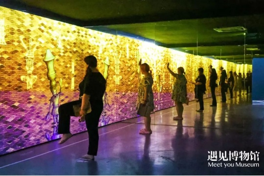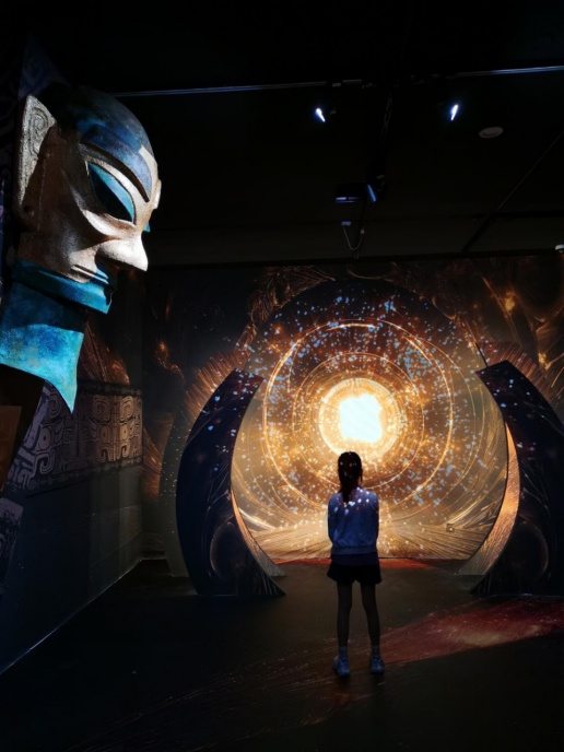 展览还特别设置了体感交互环节,观众通过定点识别后可以生成自己的古蜀人体态镜像,随着身体摆动,对应的古蜀人也随之舞动,仿佛现代人与古蜀人跨越时空的交流。