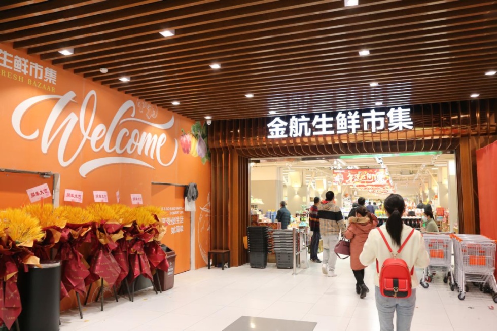 地下一楼为金航生鲜市集,商品种类齐全,货架走道间距宽敞,致力为社区居民打造一个“舒心便捷”的市场购物环境,满足居民便利购物和放心购菜的生活需求。